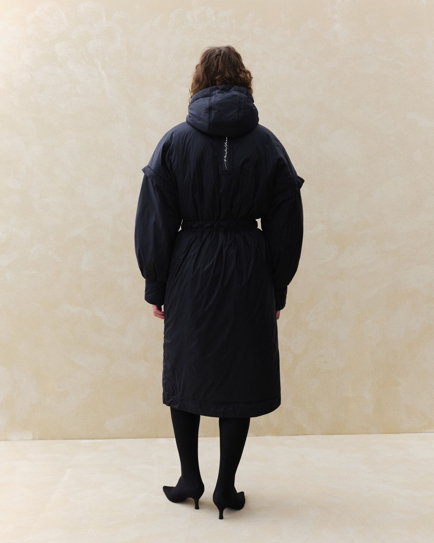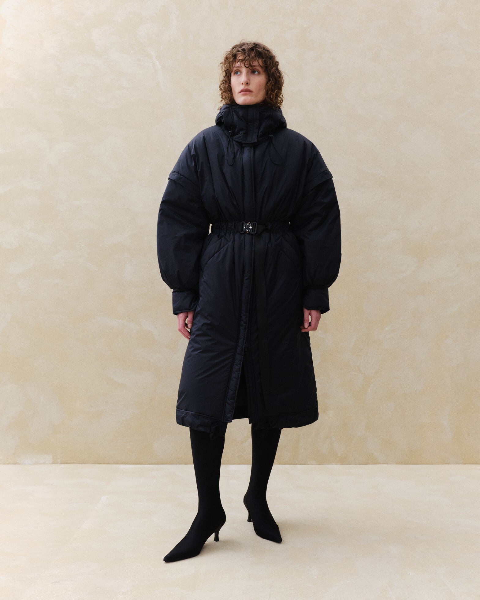 The jacket is a loose fitting reflecting the Brand’s modern aesthetics, black in color.