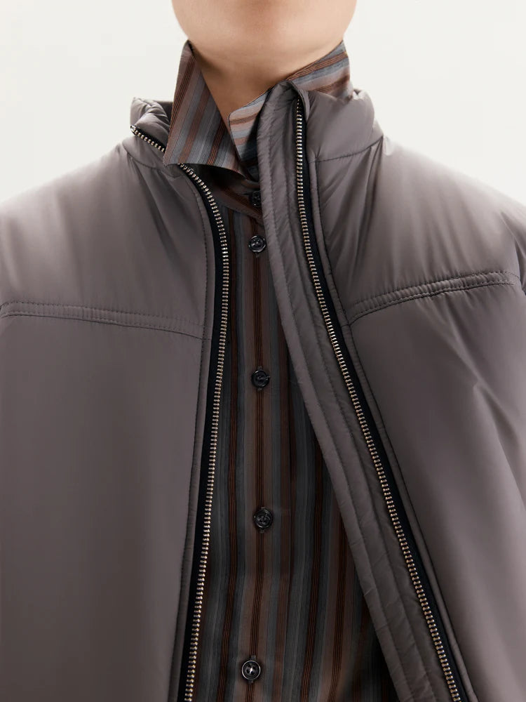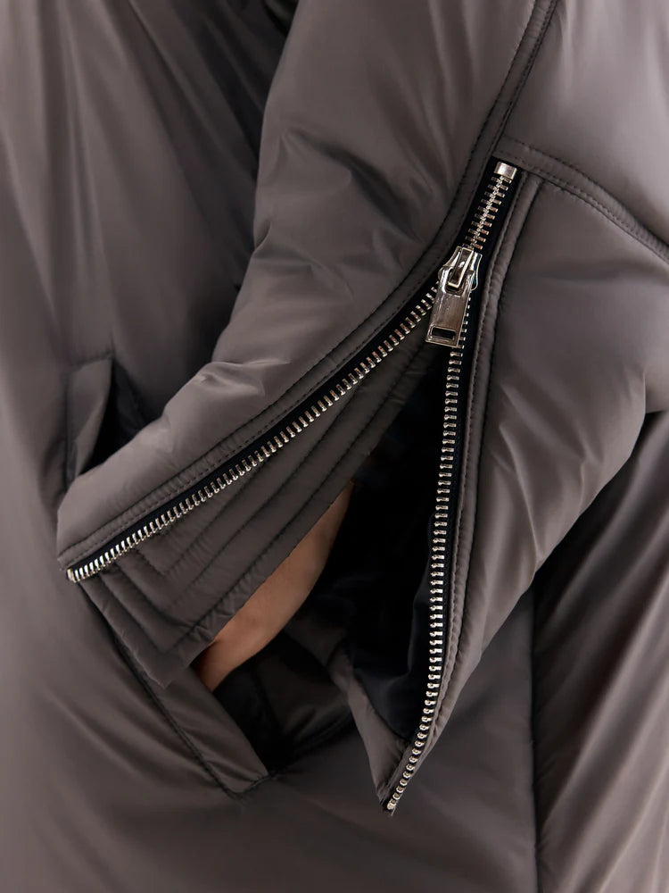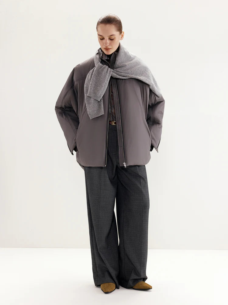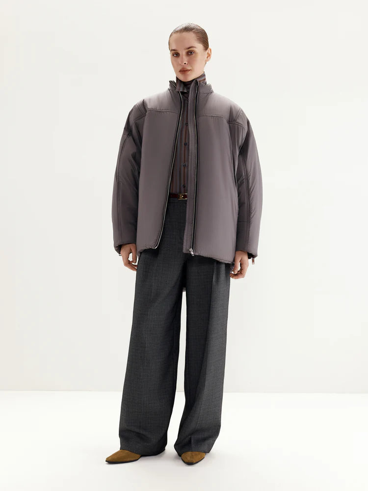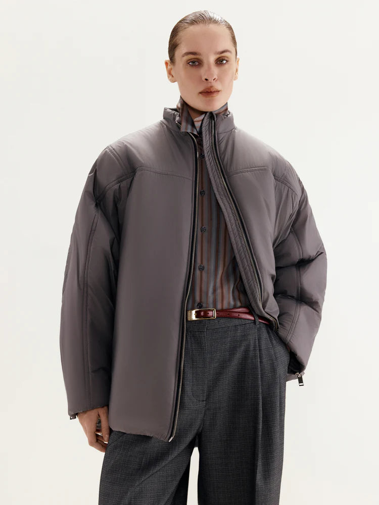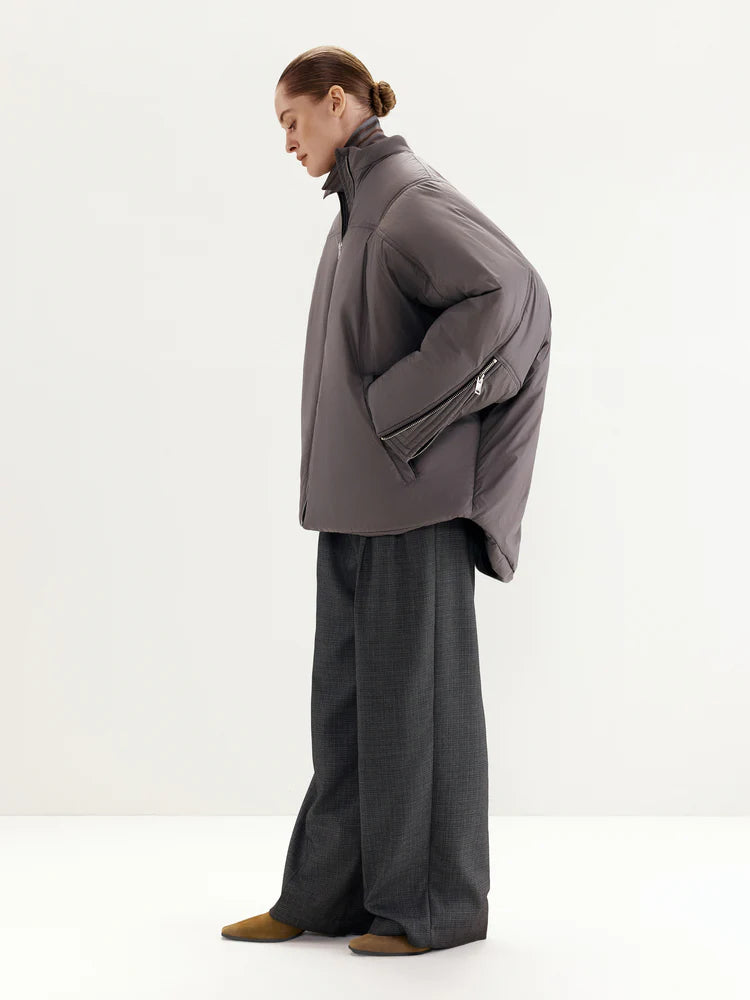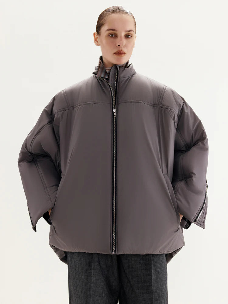 The jacket features a front zipper closure, with additional zippers on the sleeves for customizable styling—unzip them for a more relaxed look. The asymmetrical cut, shorter in the front and longer in the back, adds a distinctive accent to the design. The stand-up collar ensures added comfort and warmth.