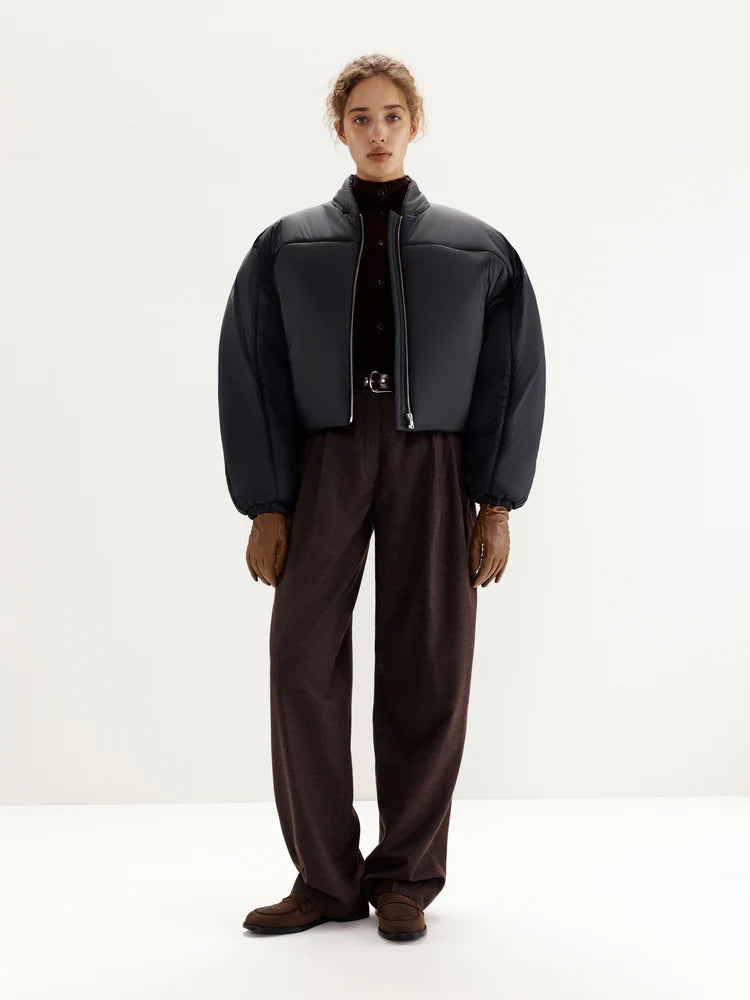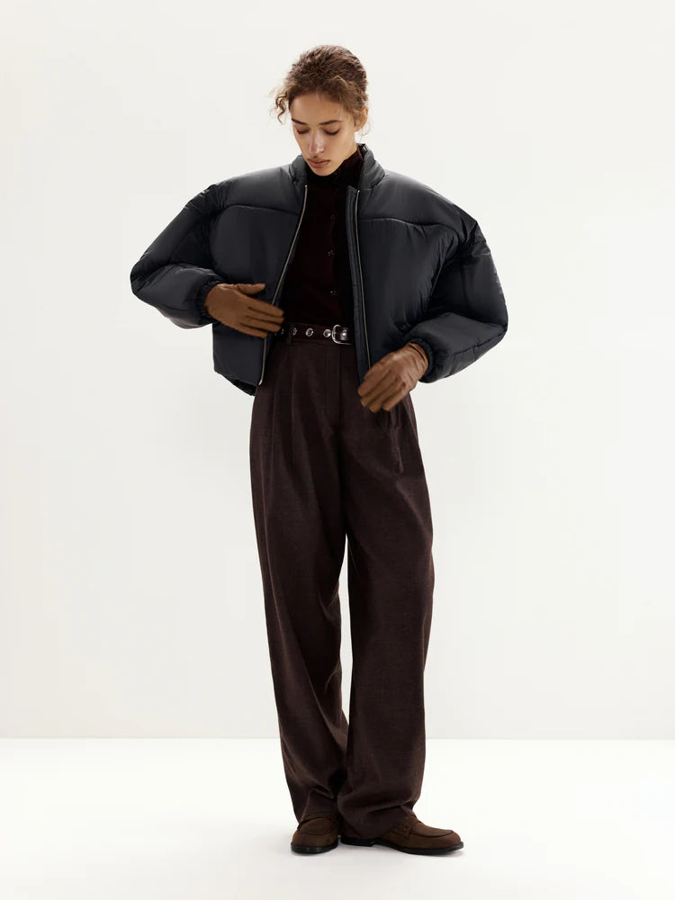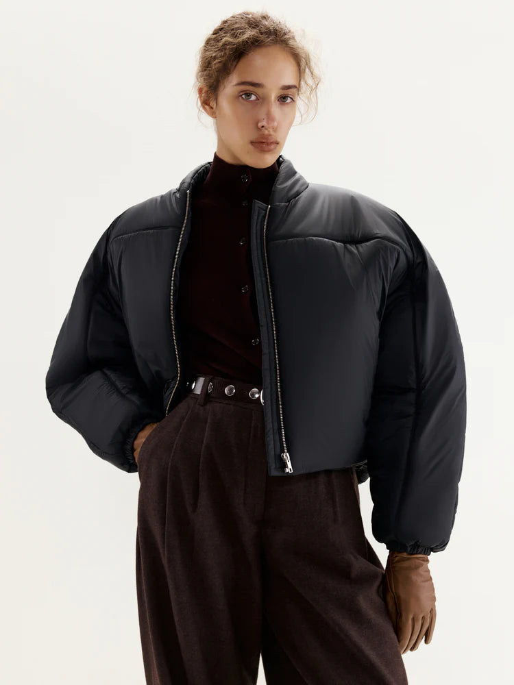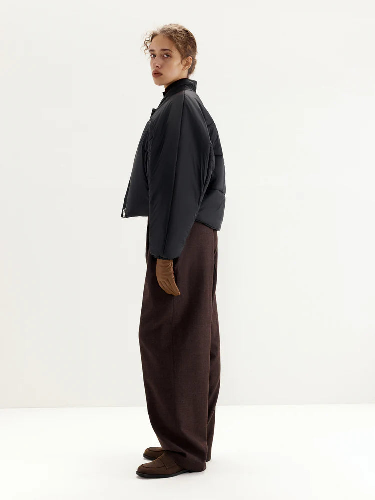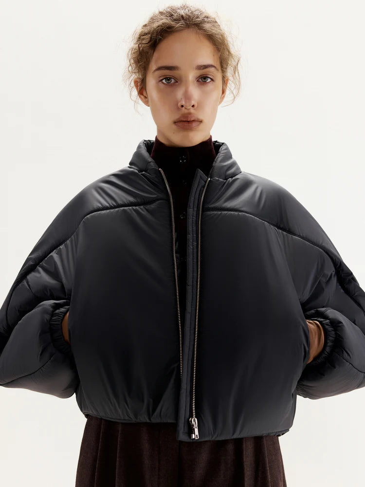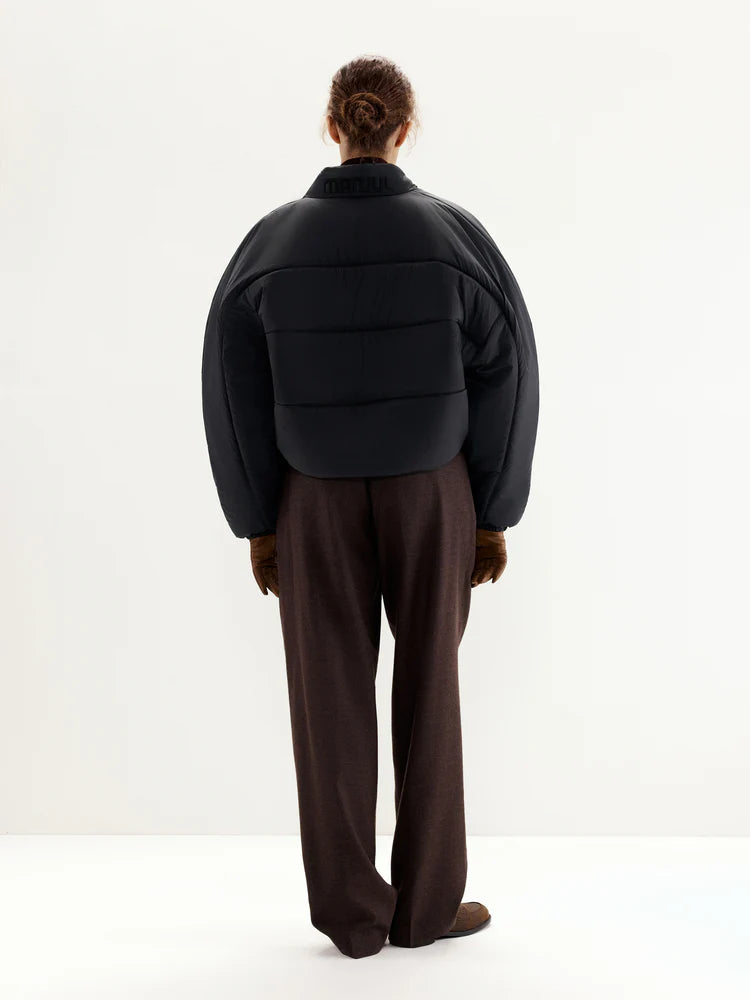 The MANJUL short jacket is voluminous, versatile, and extremely comfortable. The soft stand-up collar adds elegance and comfortably wraps around the neck. The jacket zips up at the front, making it practical and easy to wear. It will be a great addition to your wardrobe for any season.