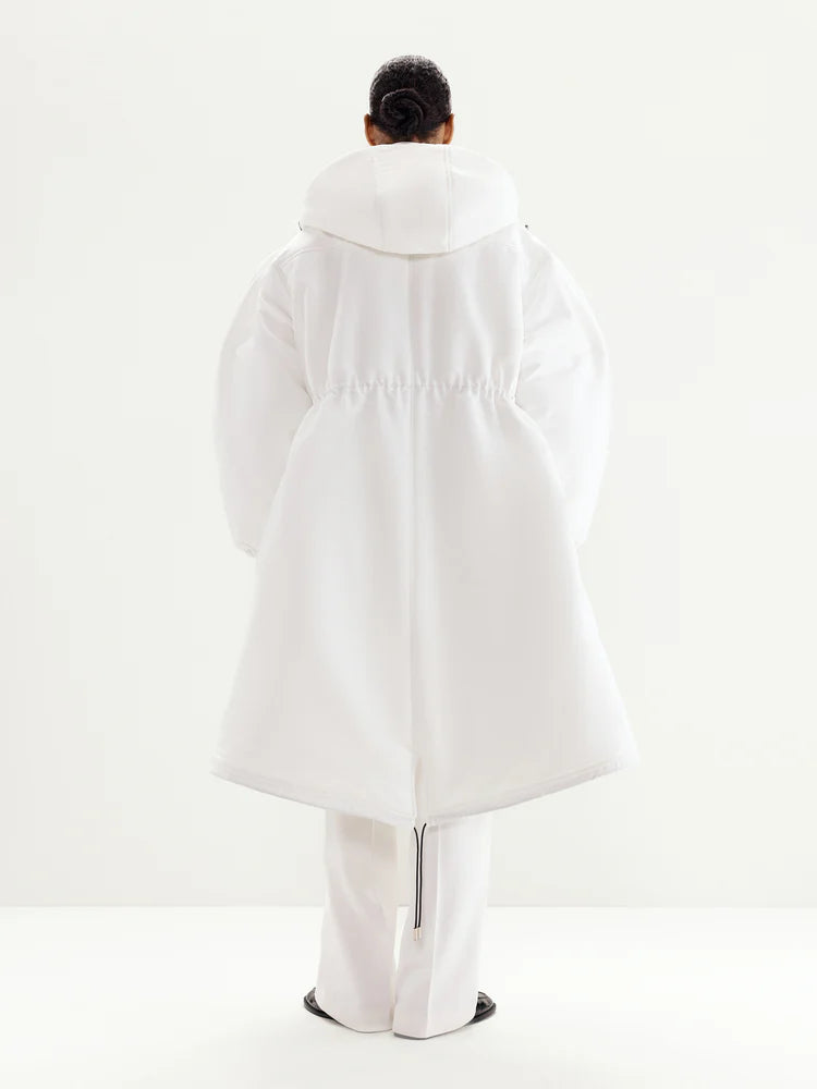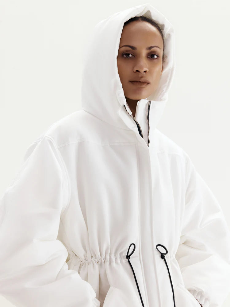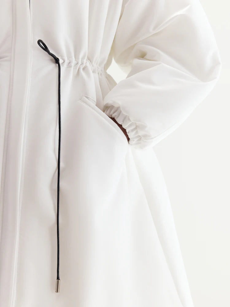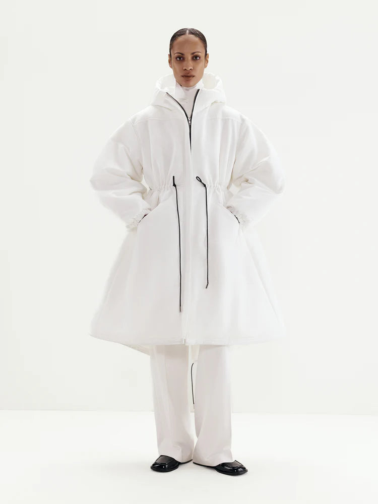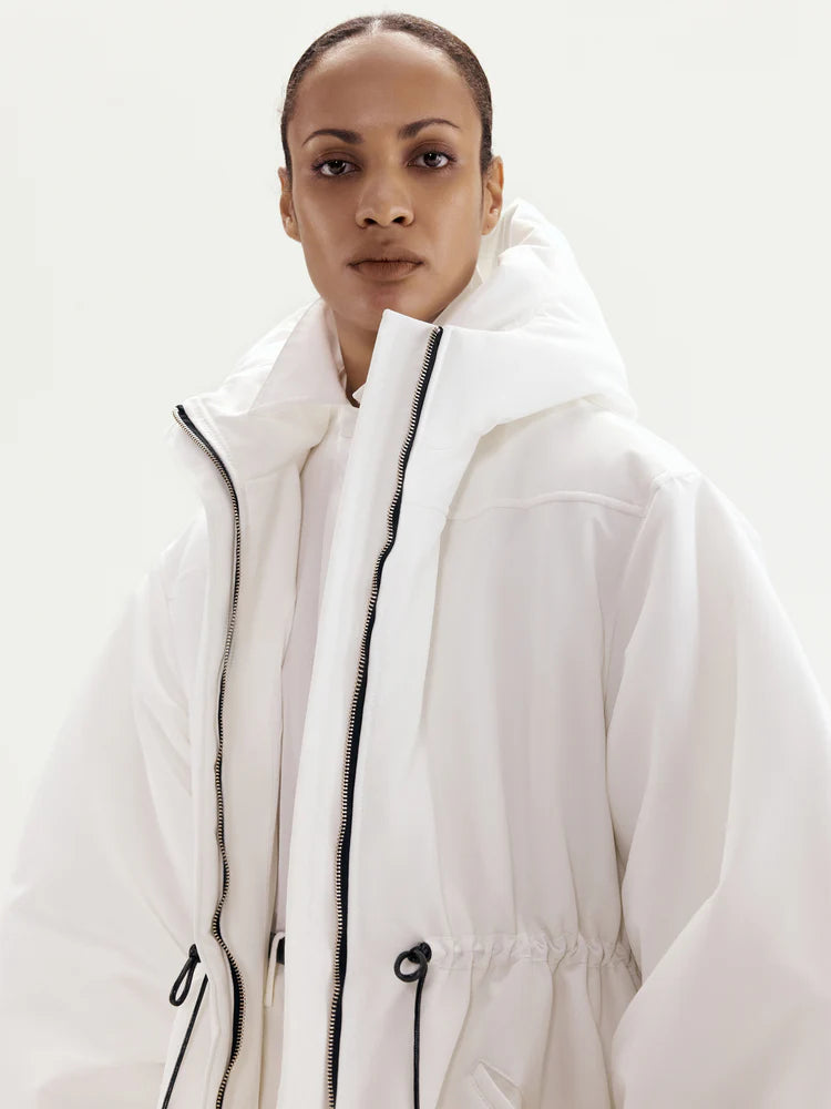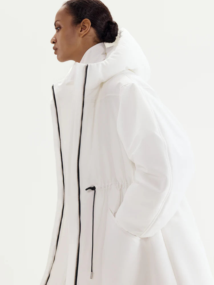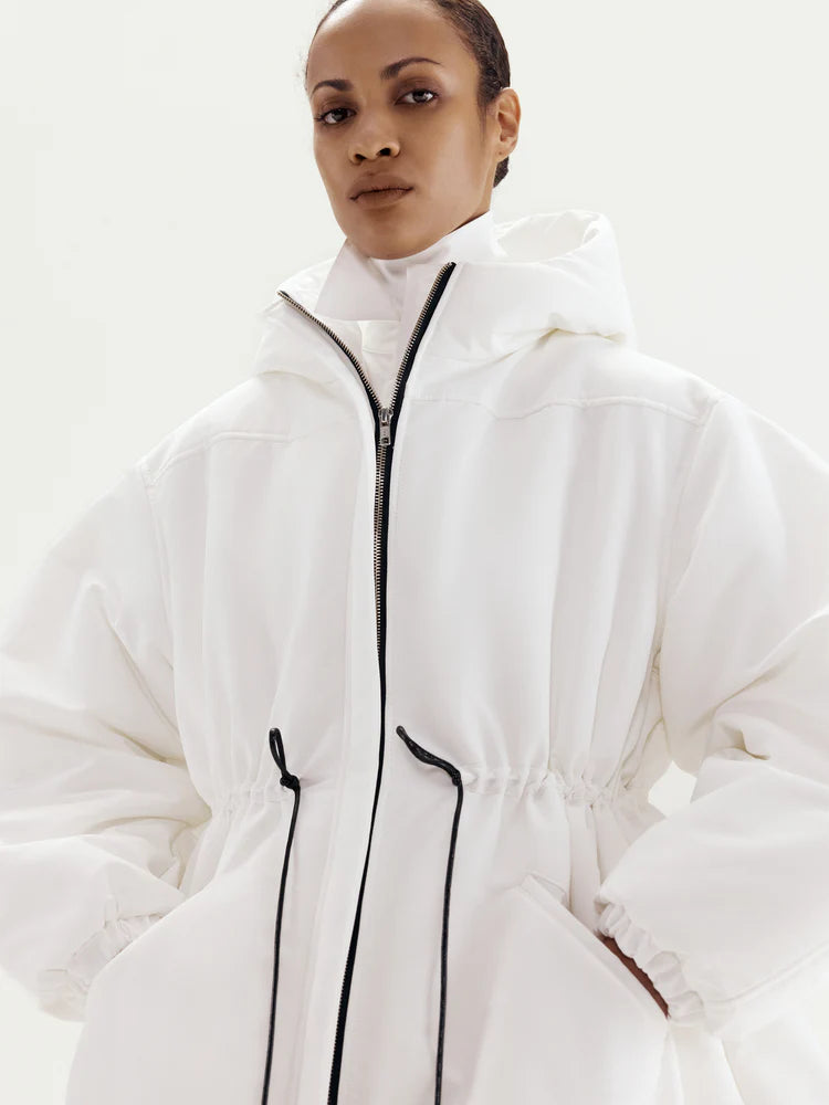 The MANJUL Parka is a voluminous and functional design, perfect for winter weather. Its thoughtfully extended length ensures maximum comfort even on the coldest days. The front zipper seamlessly transitions into a hood, providing additional protection from wind and cold. The adjustable drawstring at the waist allows you to customize the fit, ensuring a tailored silhouette and optimal insulation. Elastic cuffs on the sleeves enhance convenience and help retain warmth. This parka is a reliable companion for any winter conditions.