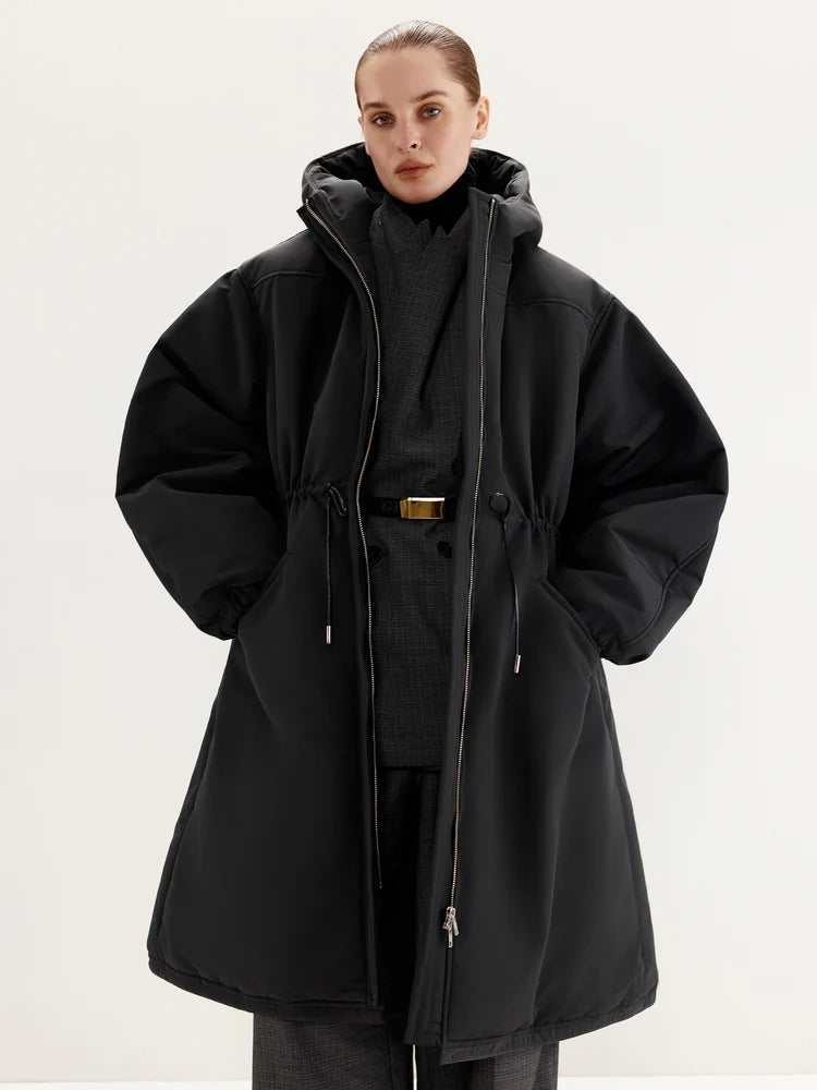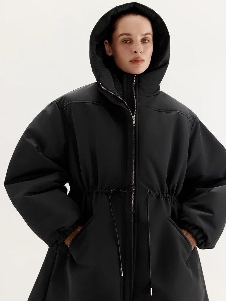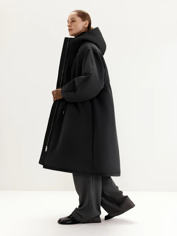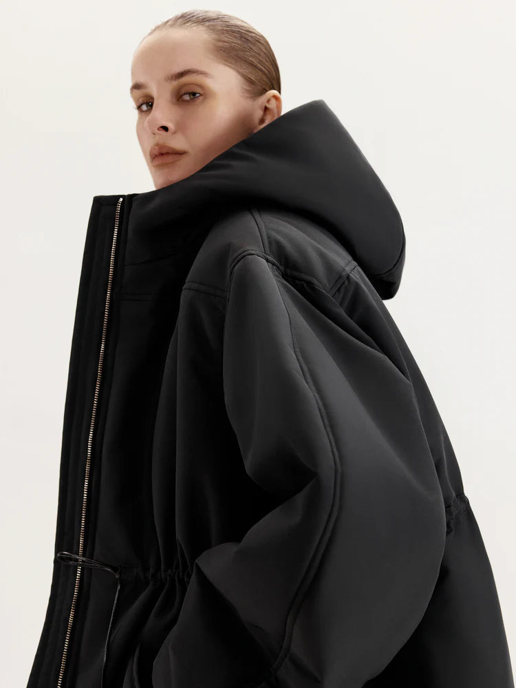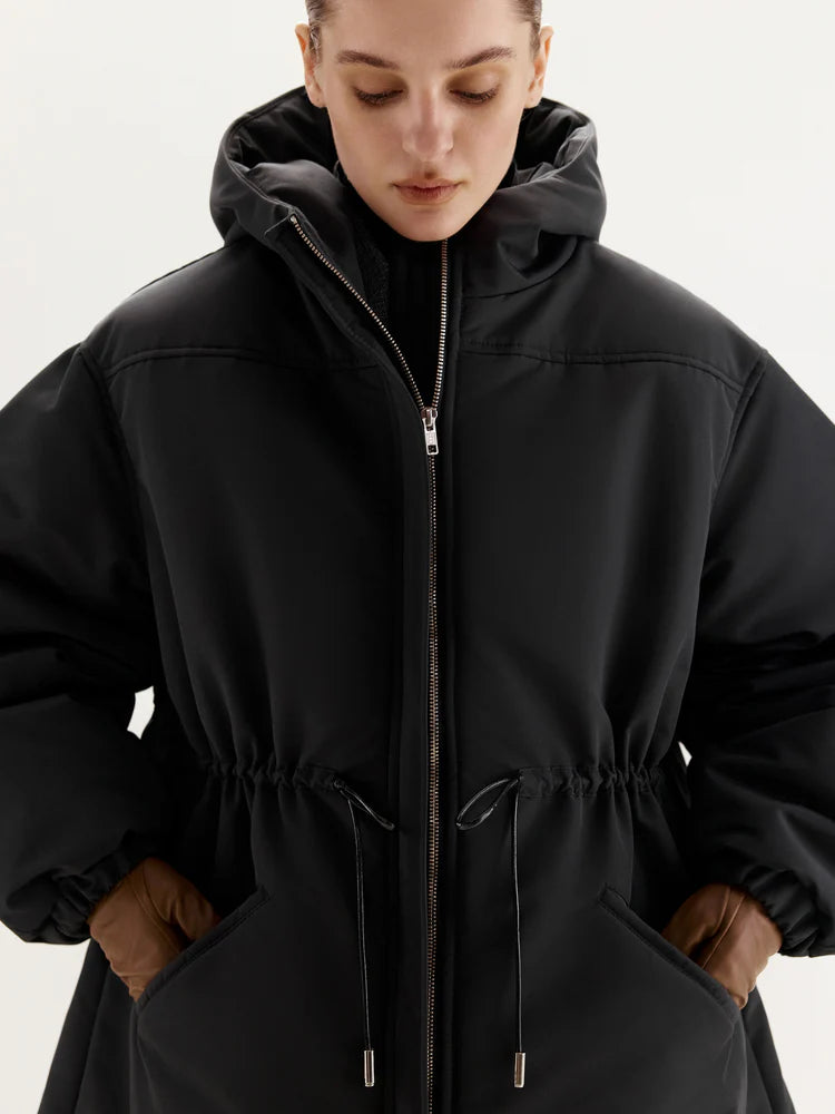 The MANJUL Parka is a voluminous and functional design, perfect for winter weather. Its thoughtfully extended length ensures maximum comfort even on the coldest days. The front zipper seamlessly transitions into a hood, providing additional protection from wind and cold. The adjustable drawstring at the waist allows you to customize the fit, ensuring a tailored silhouette and optimal insulation. Elastic cuffs on the sleeves enhance convenience and help retain warmth. This parka is a reliable companion for any winter conditions.
