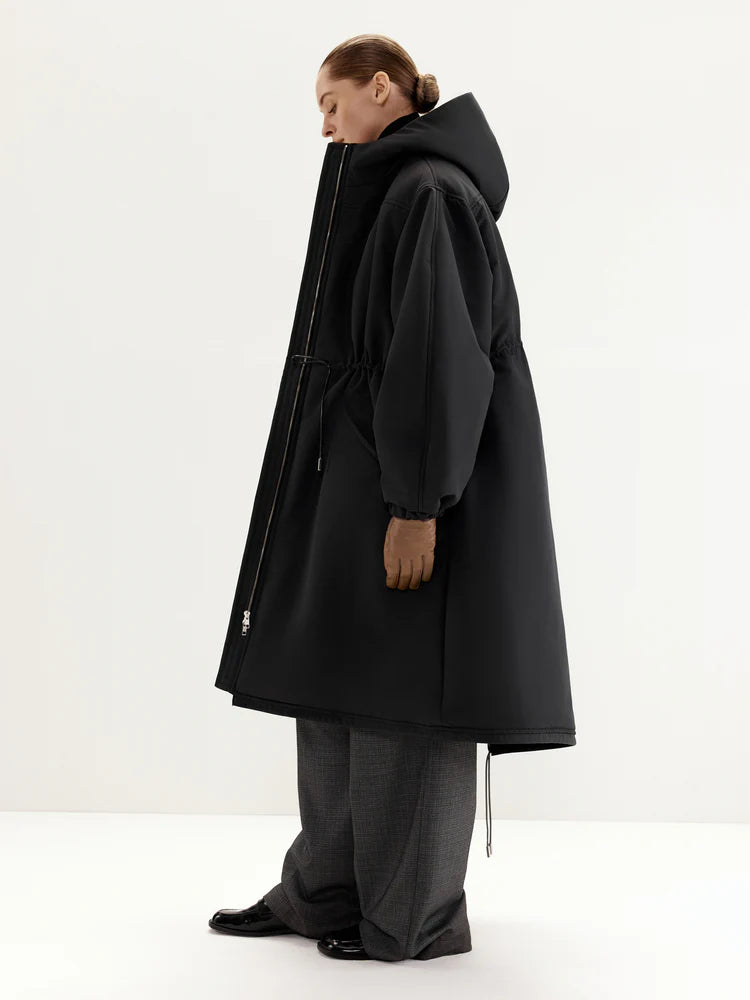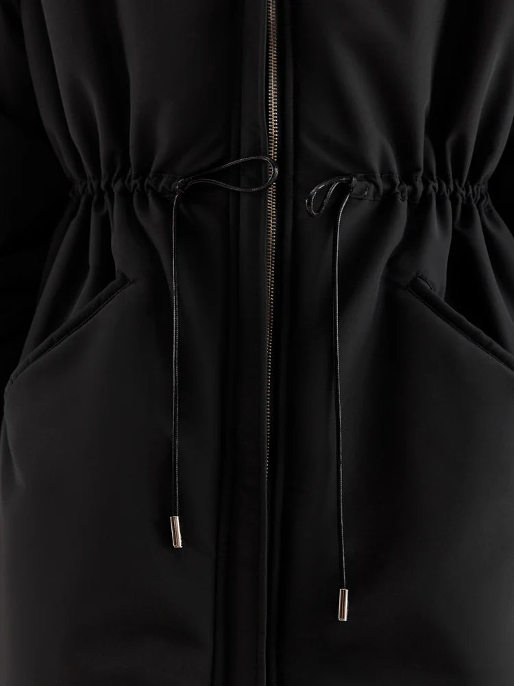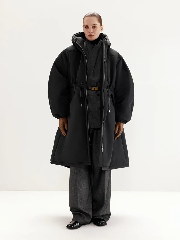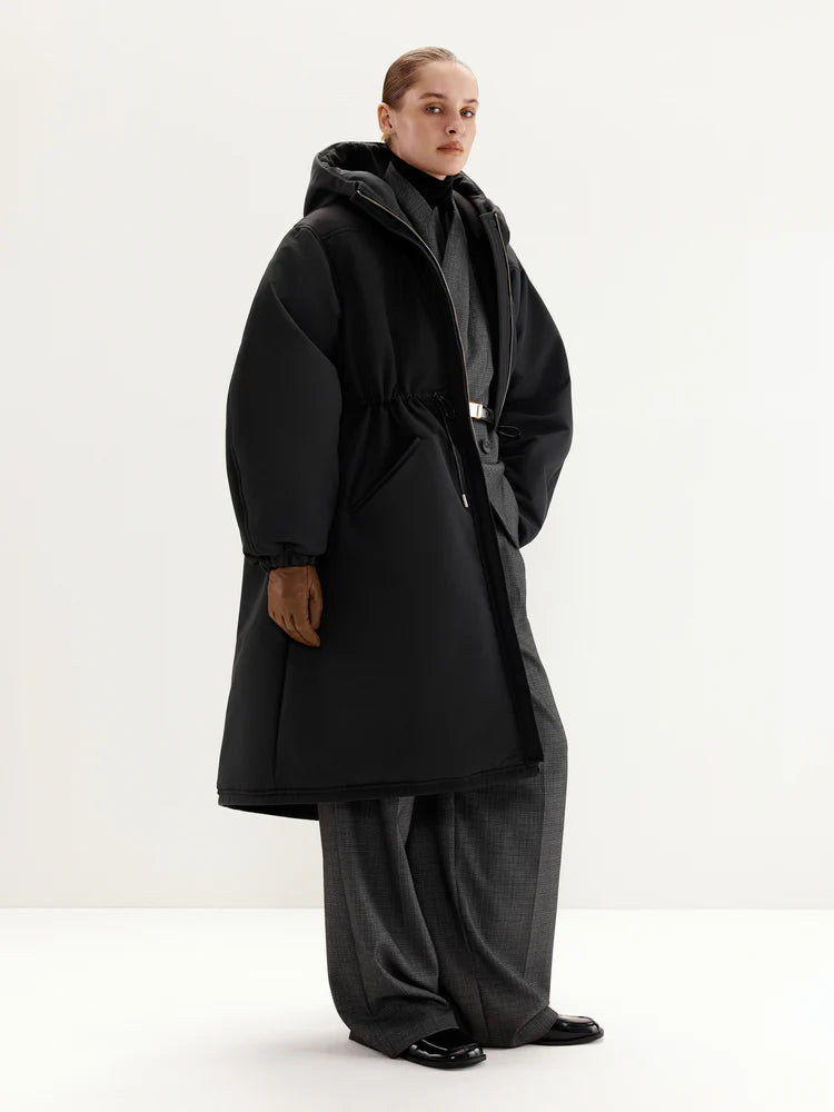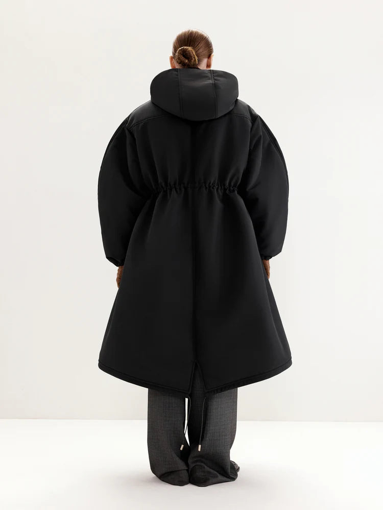 The MANJUL Parka is a voluminous and functional design, perfect for winter weather. Its thoughtfully extended length ensures maximum comfort even on the coldest days. The front zipper seamlessly transitions into a hood, providing additional protection from wind and cold. The adjustable drawstring at the waist allows you to customize the fit, ensuring a tailored silhouette and optimal insulation. Elastic cuffs on the sleeves enhance convenience and help retain warmth. This parka is a reliable companion for any winter conditions.
