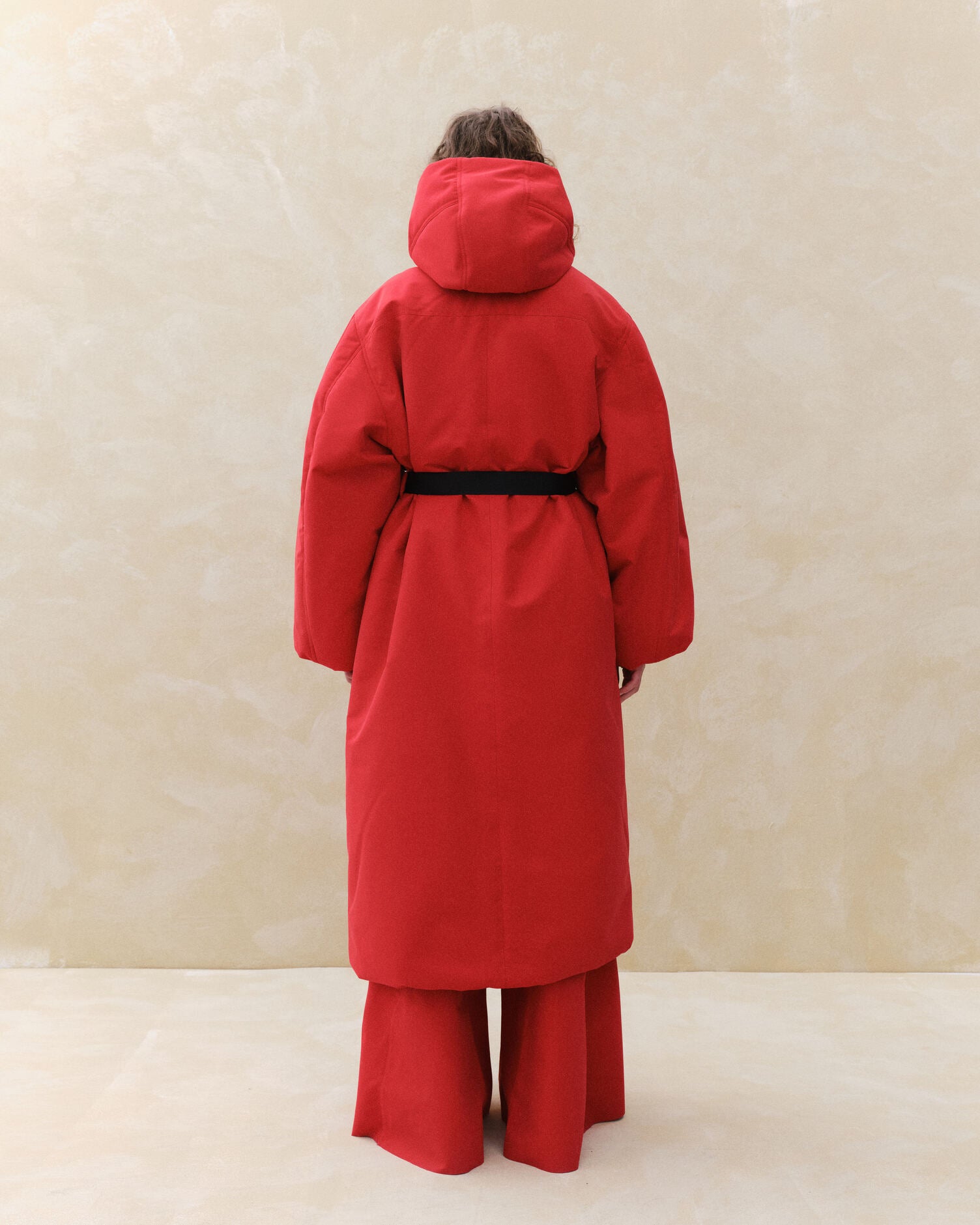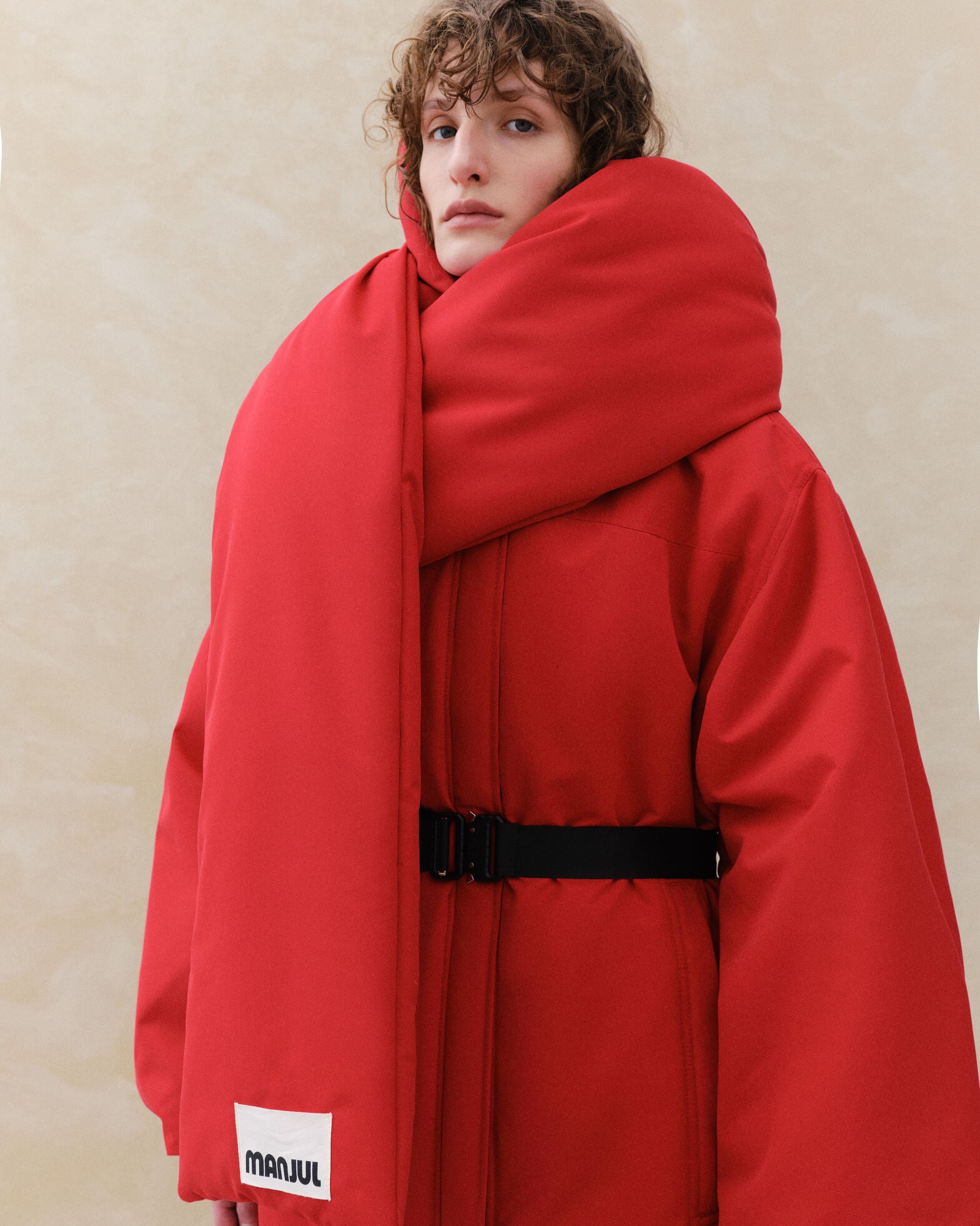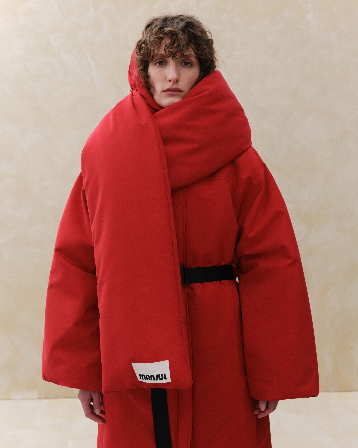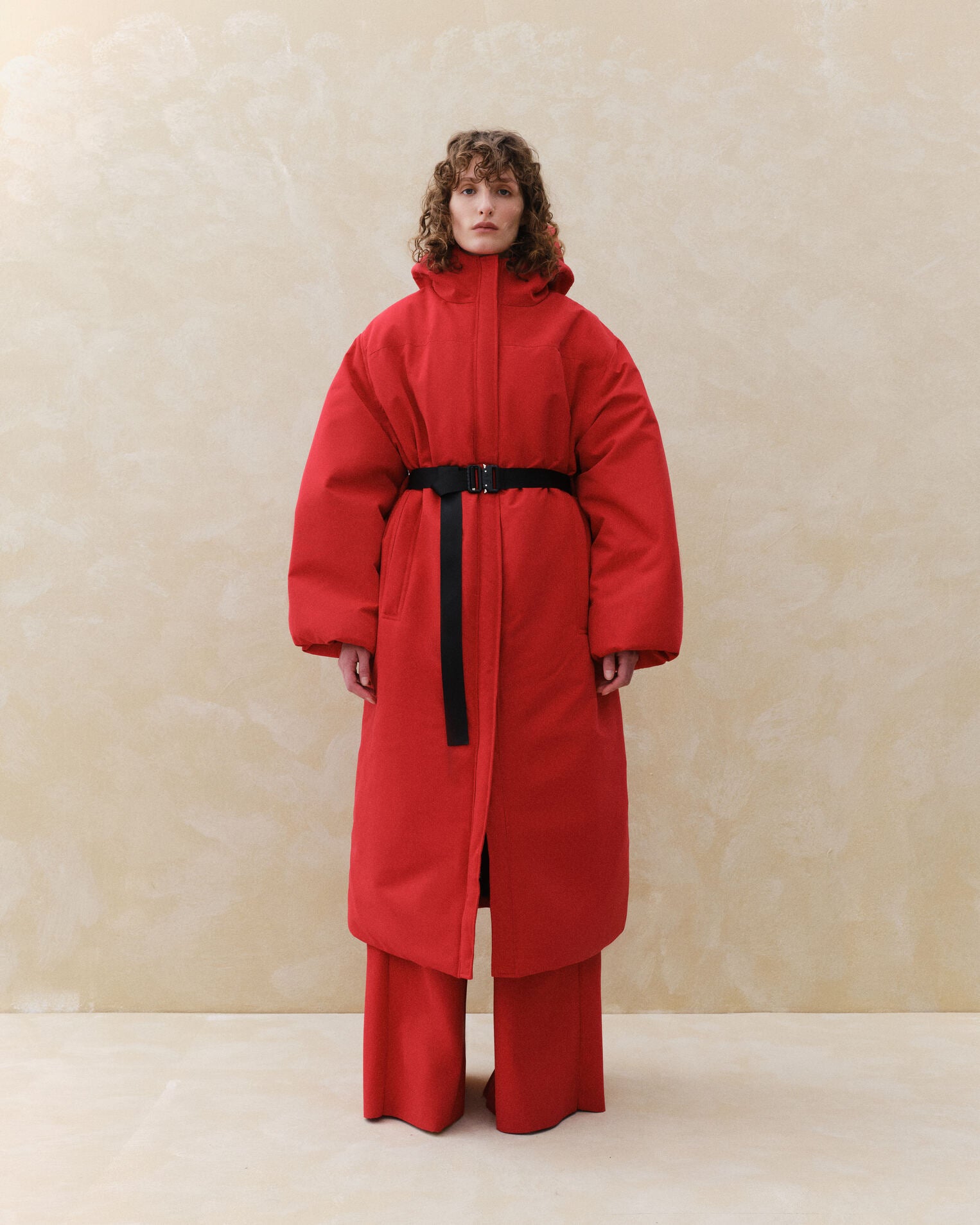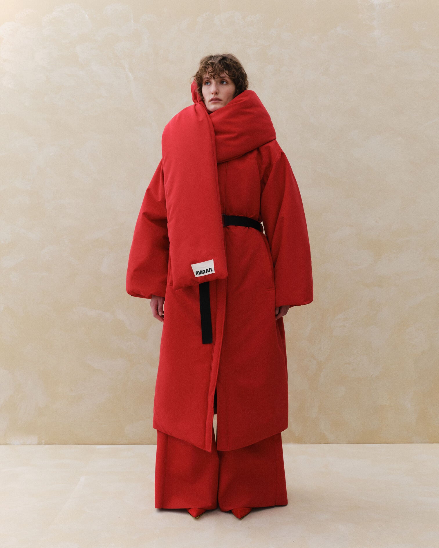 A stylish full-length puffer jacket stands out with its modern voluminous silhouette and wide sleeves with elastic cuffs.