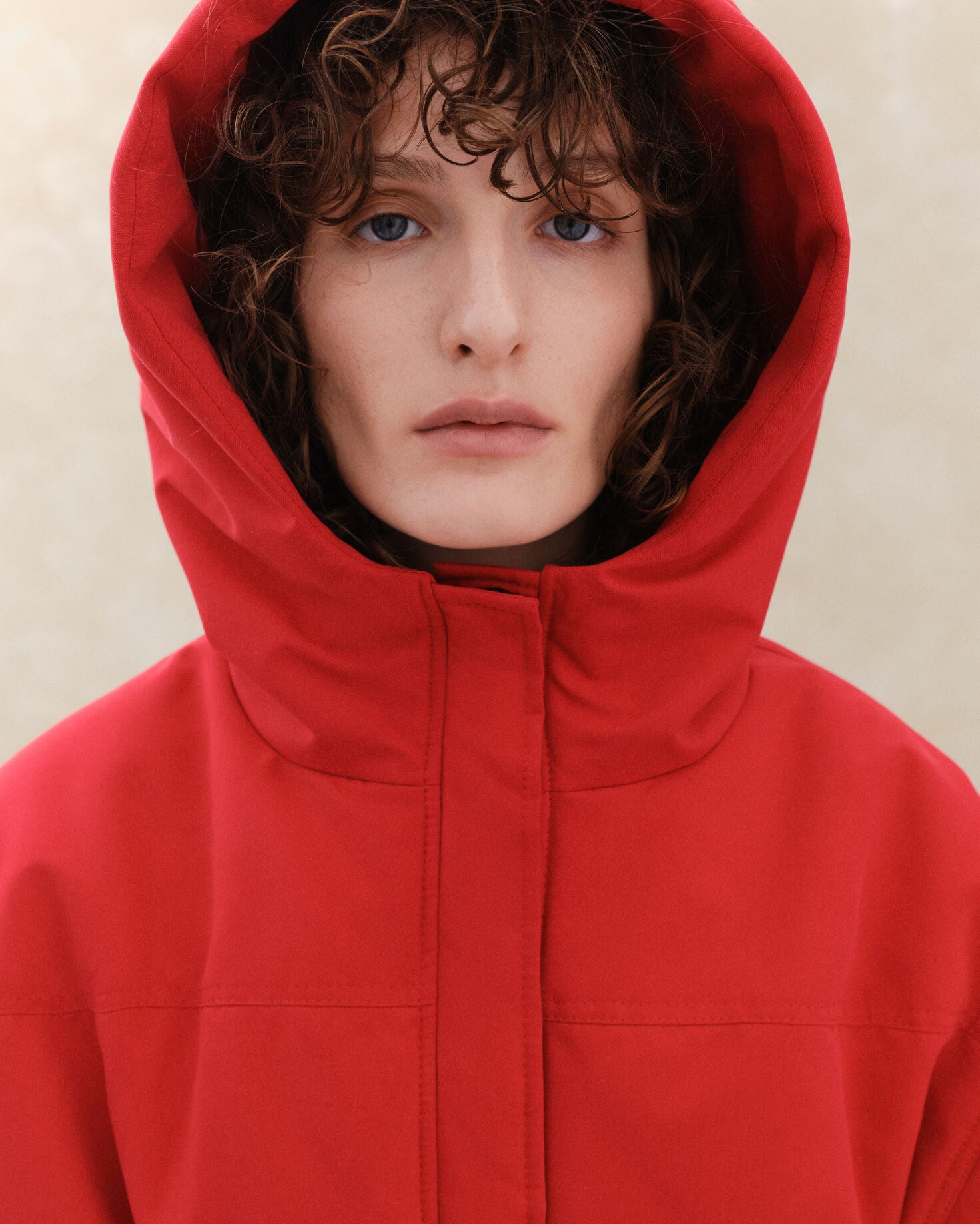 The central zipper closure, hidden under a front placket, along with the high collar, effectively protects from the wind.